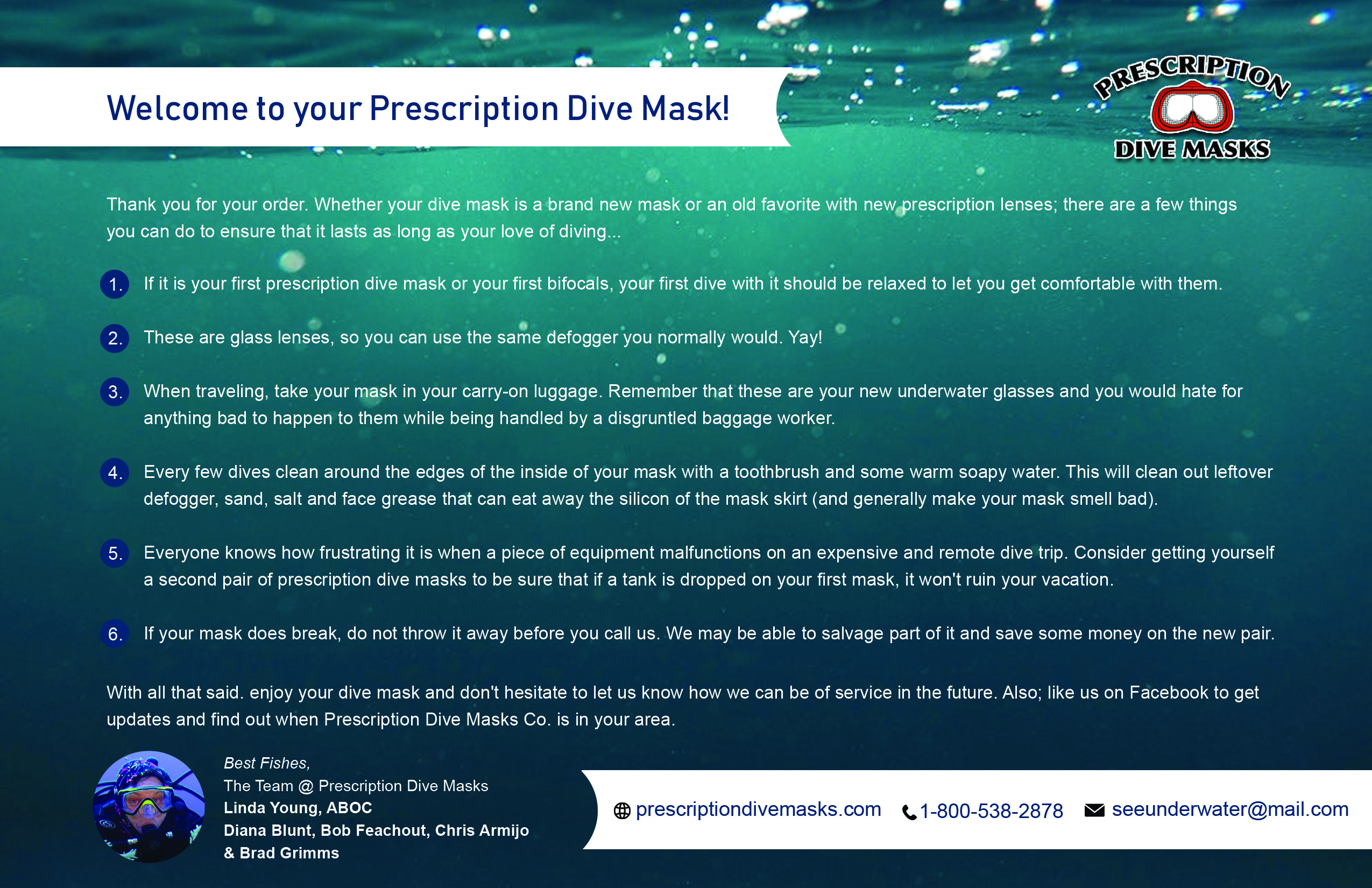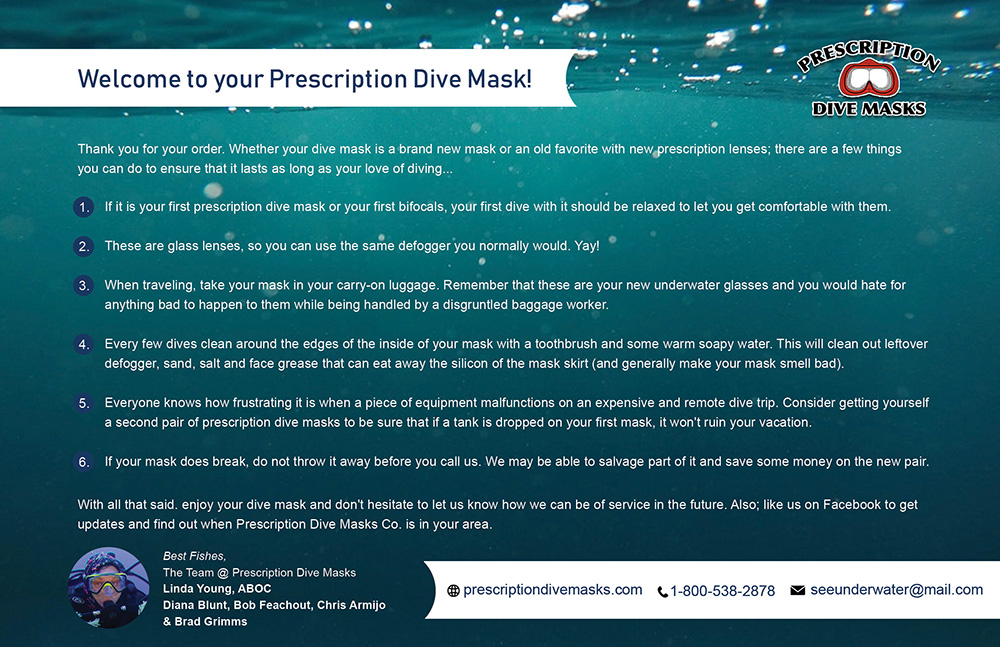 With all that said, enjoy your dive mask and don’t hesitate to let us know how we can be of service in the future. Also; like us on Facebook to get updates and find out when Prescription Dive Masks, is in your area.